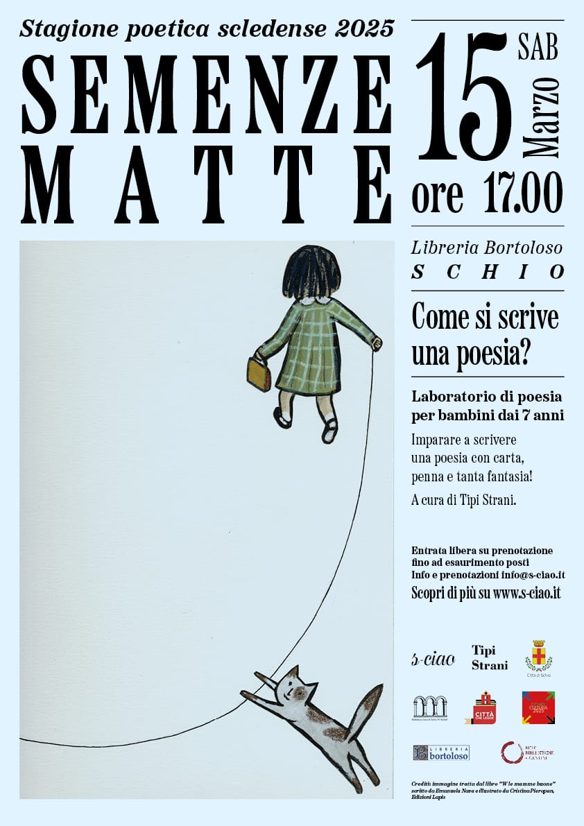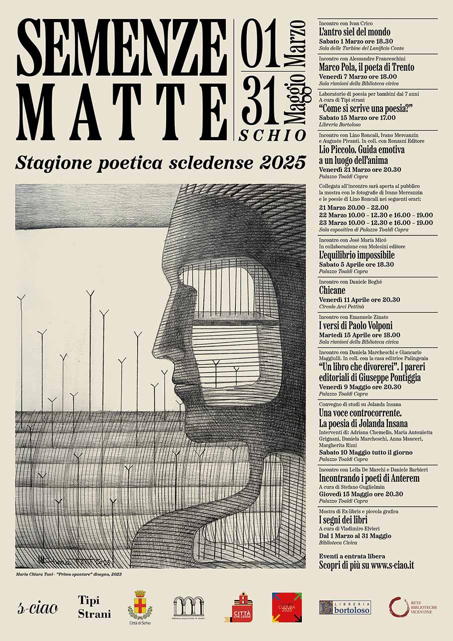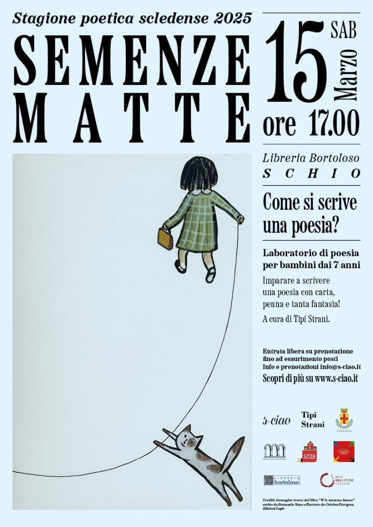 Da marzo fino alla fine di maggio, a Schio, avranno luogo una serie di appuntamenti per approfondire e scoprire poeti contemporanei e non. Ci saranno incontri con poeti, professori universitari, un convegno di studi, una mostra fotografica e una mostra di Ex libris e piccola grafica. Per i bambini, invece, un laboratorio, curato da Tipi strani, su come imparare a scrivere una poesia. Tutti gli incontri sono ad entrata libera. [...]